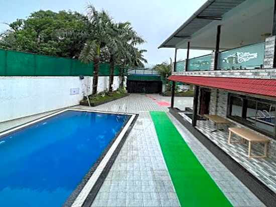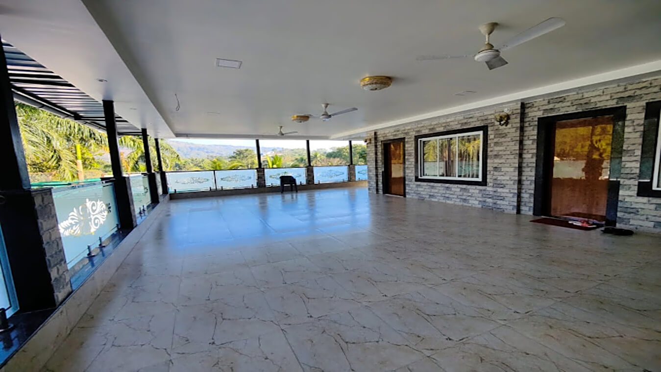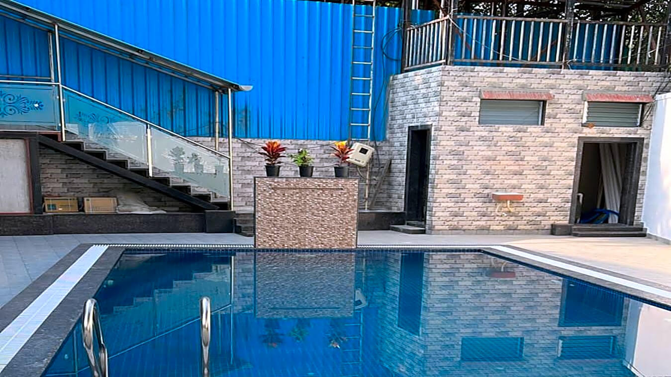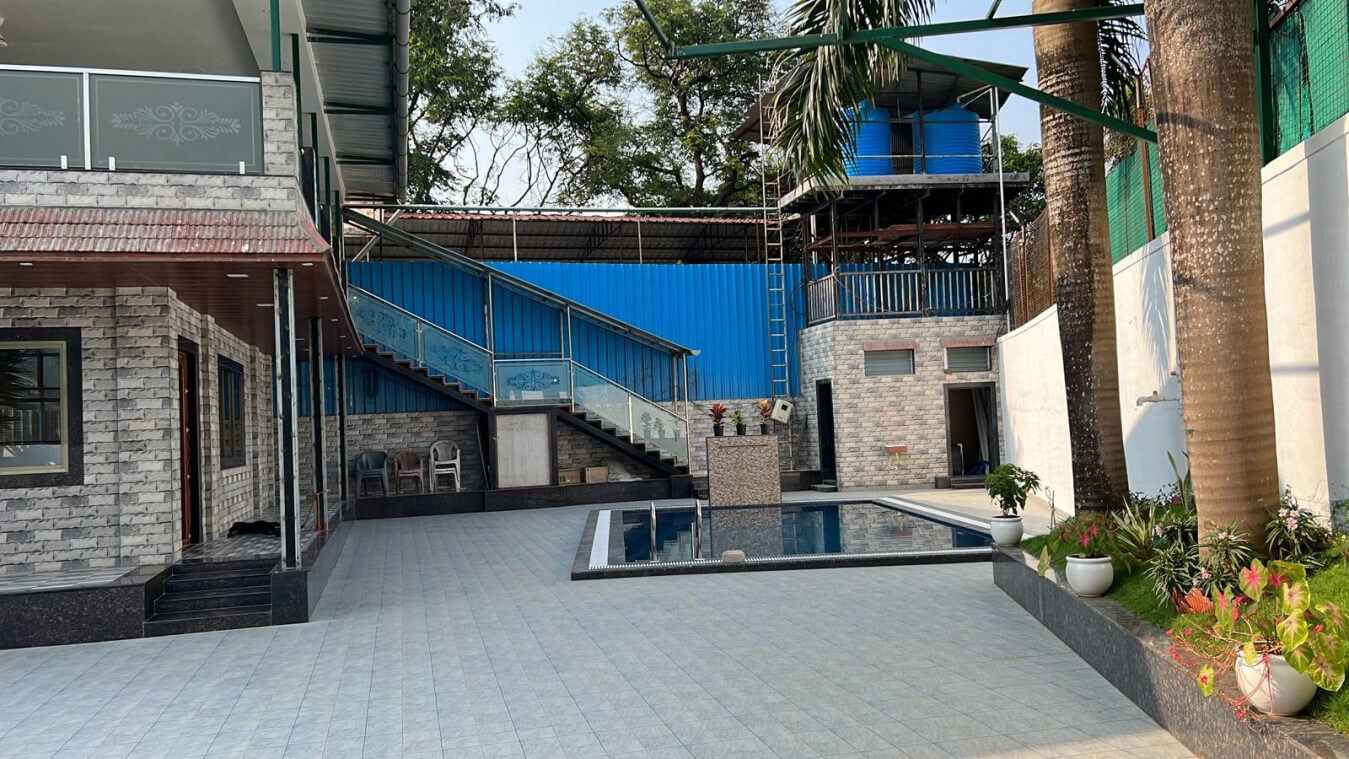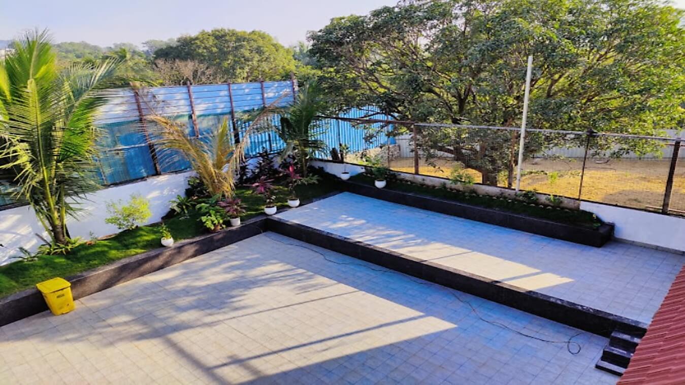 Outdoor space is with full grown trees and podium. The outdoor pool and tiled space are a perfect settings for you to relax and enjoy the chilled night Yeoor weather. It has an outdoor 1st floor lounge area with dinning faclity also you can enjoy the views from there.
