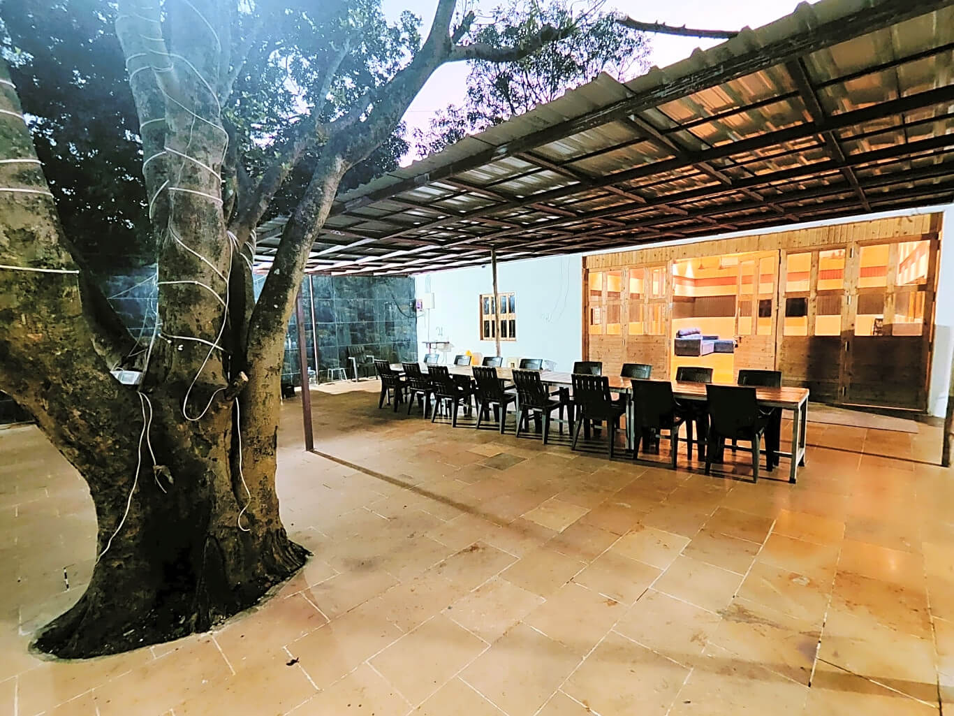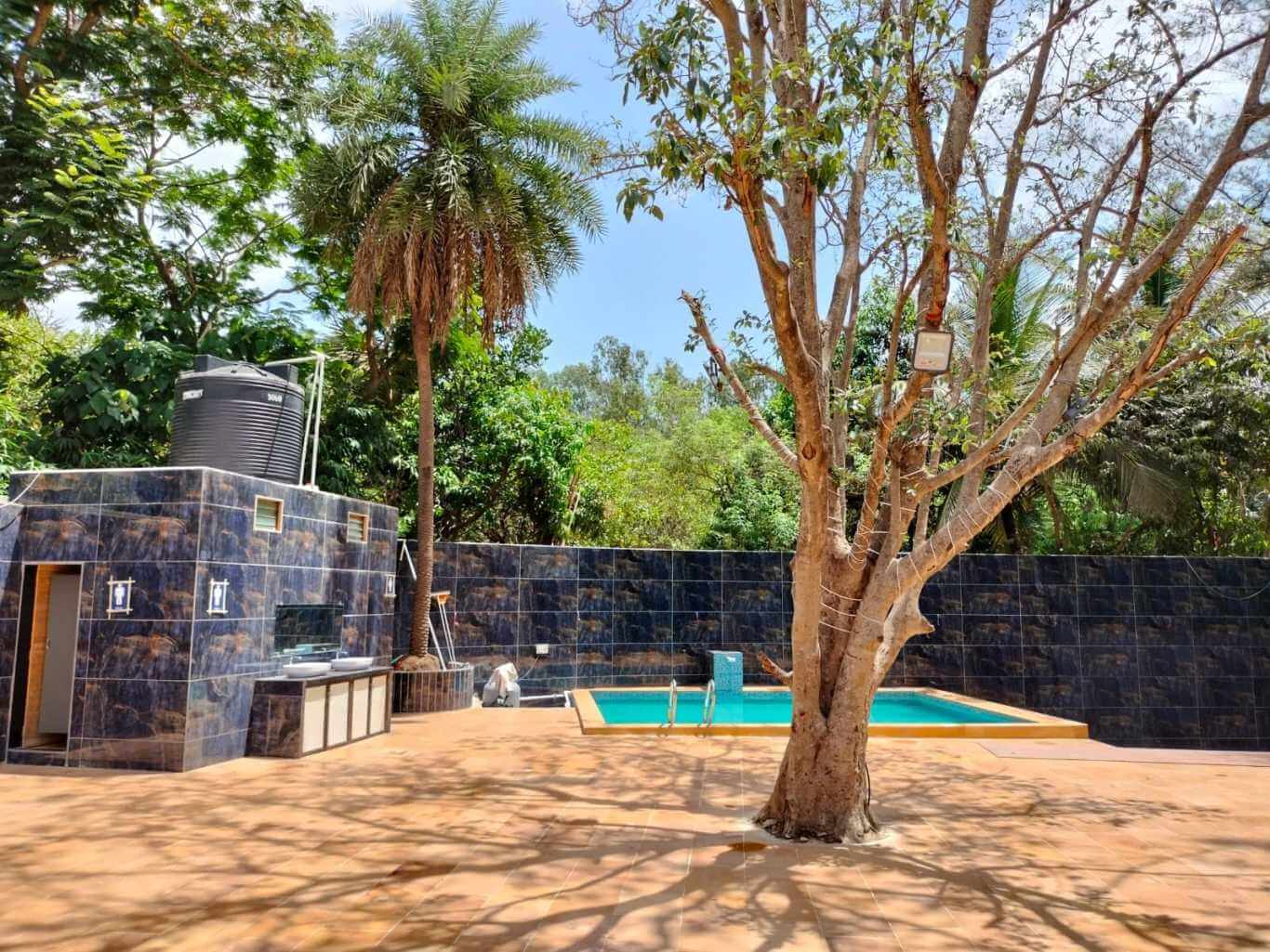Outdoor space is tiled and has lawns. The outdoor pool and tiled space are a perfect settings for a barbeque and bonfire to enjoy the chilled night Yeoor weather. It also has a outside sitout area.